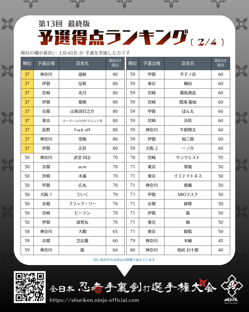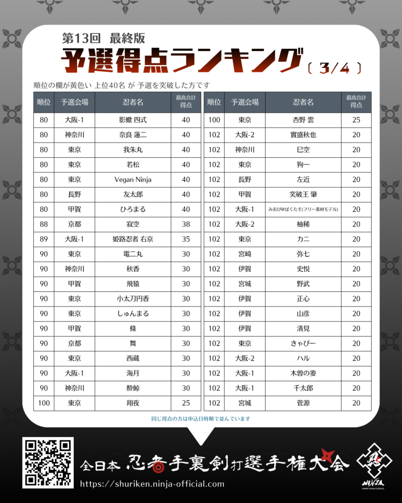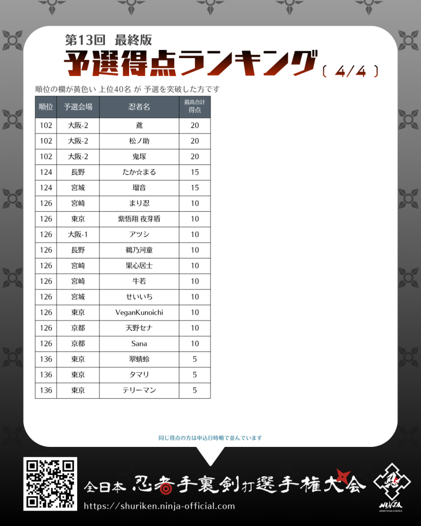 予選通過者のうち、出場辞退者がいた場合、繰り上げで出場をご案内することがあります。