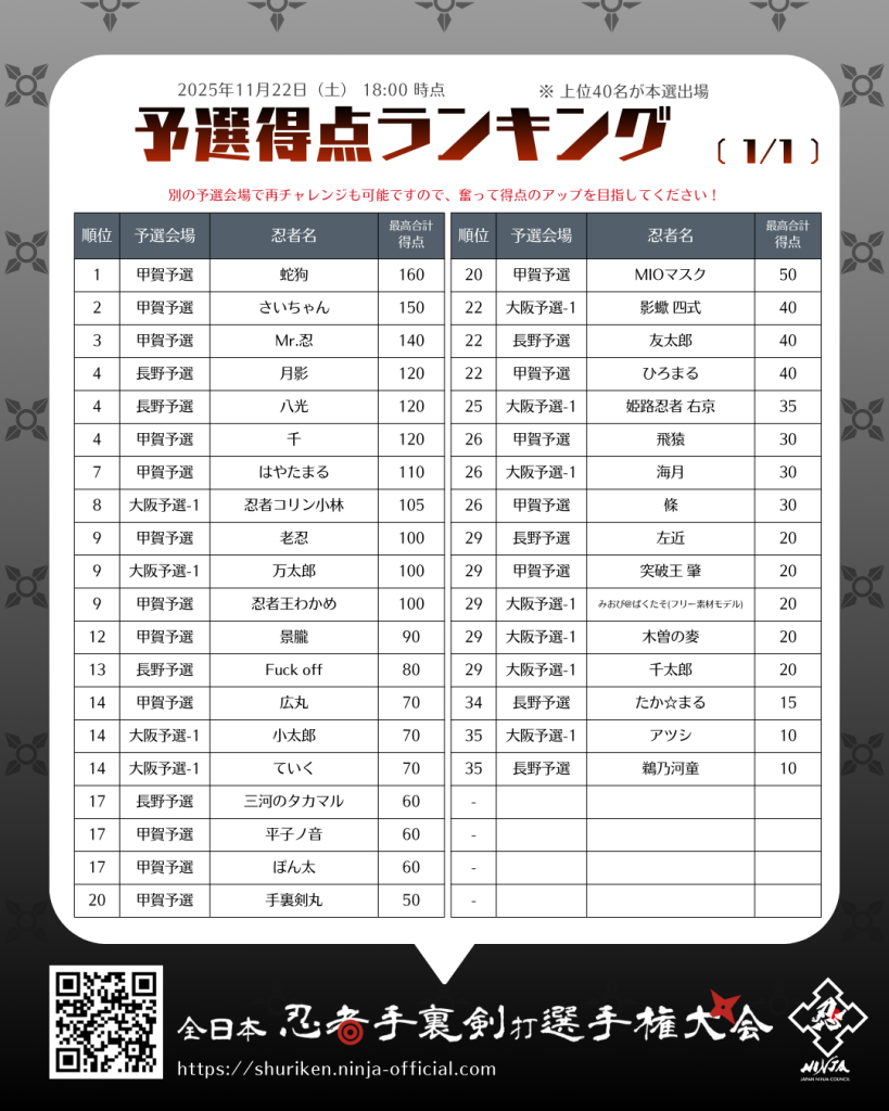 12月末時点で最終的に上位40名に残った選手が、本選大会に出場ができます。