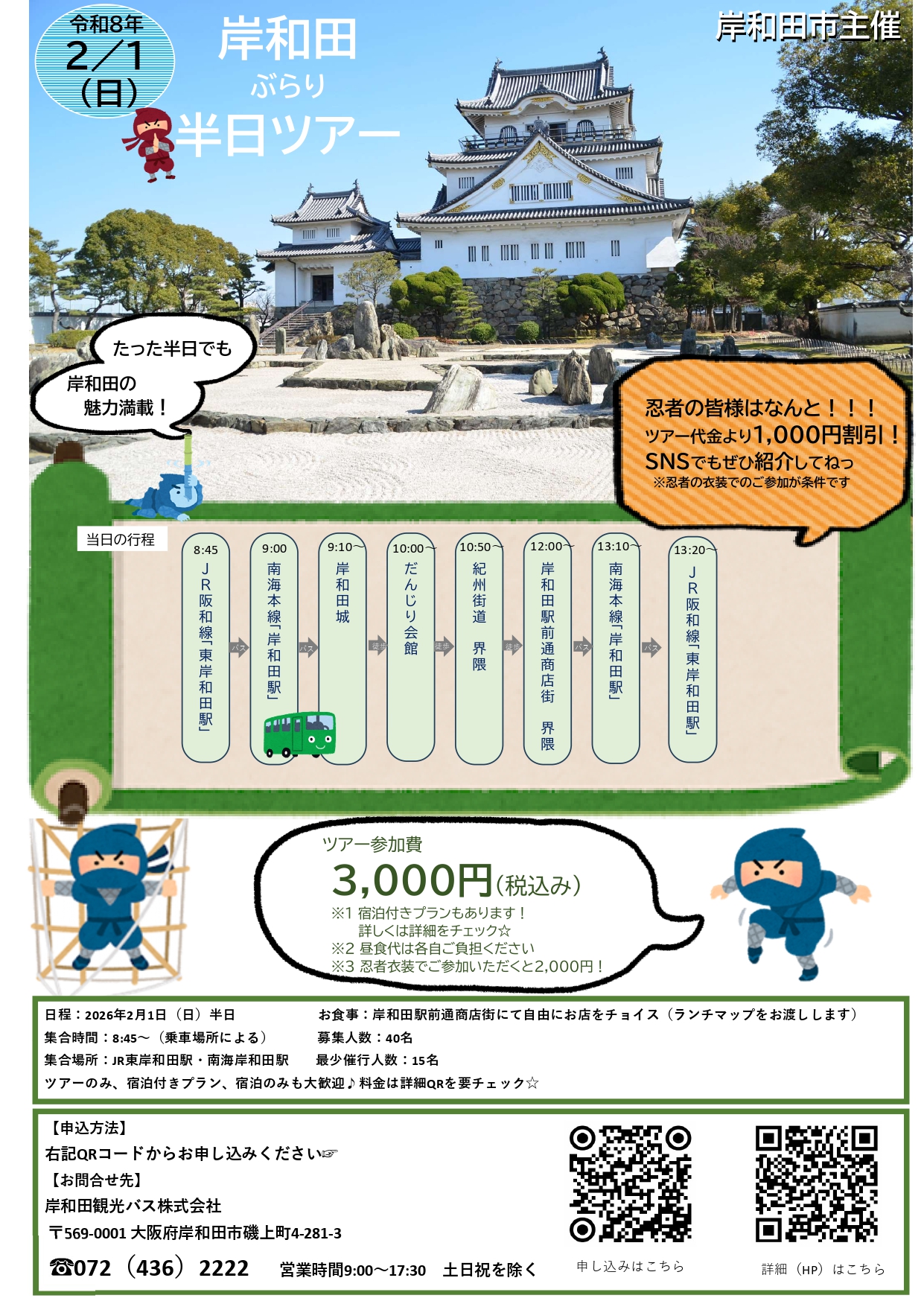 2026年1月31日(土)に岸和田で開催される全日本忍者手裏剣打大会本選にあわせて、岸和田市主催の「岸和田半日ぶらりツアー」が、本選翌日の2月1日(日)に開催されます。